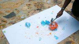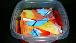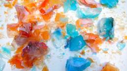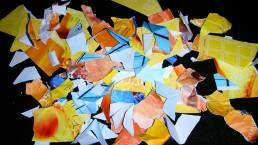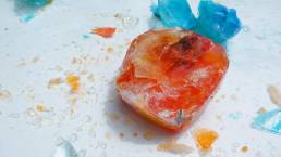 I continued to explore by placing a white poster board on the ground, then dropping the blocks onto the poster board to create a shattering effect. At first, the ice would not break, so I continued the dropping motion. Bit by bit, the ice broke. The blue block shattered faster and easier than the orange block. With a hammer and a screwdriver, I chiseled the chunks that would not break into smaller pieces. I stood back and observed. The ice didn’t shatter in the way I perceived it would, but the colors were spectacular.