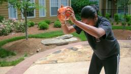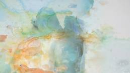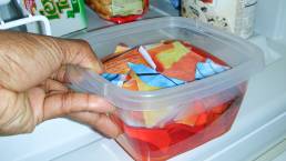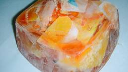 The concept of this exploration was to develop something new from something old using a process of improvisation–the notion of doing something not planned. To start the process of “letting things happen,” I cut and ripped three random designs, which represent the old. Then submerge the pieces in containers with water. I added food coloring to change the color of the water to orange and blue. I placed the containers into the freezer to be frozen. The results were misty concrete blocks that yielded lines, patterns, and shapes. I was intrigued by the outcome.