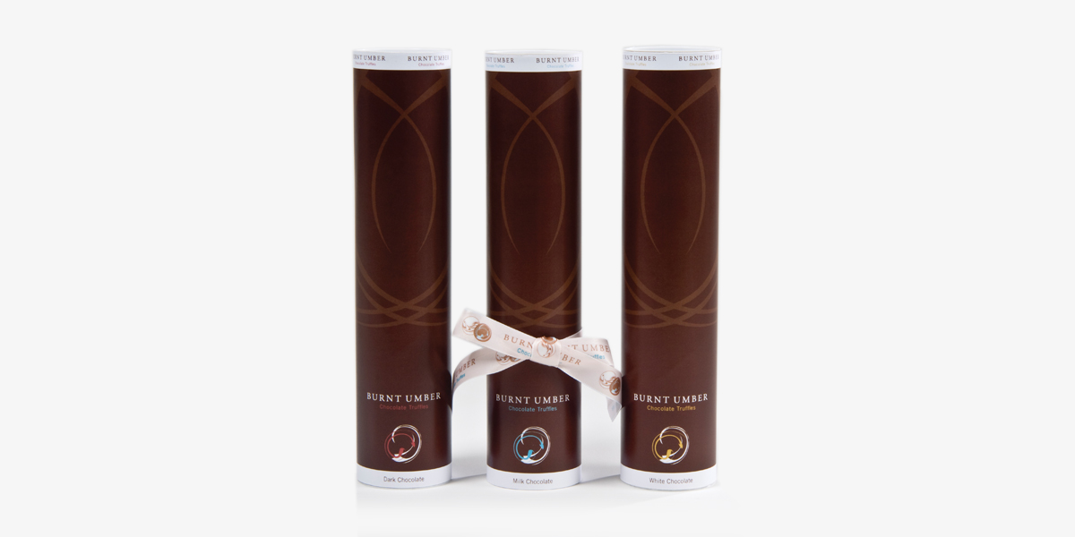 Burnt Umber chocolate truffles will put a smile on anyone’s face. Beautifully packaged in gourmet tube canisters are milk, dark and white chocolate truffles that make a terrific gift for the chocolate lover. All truffles are round with swirls of color. The natural dark brown pigment of chocolates inspired the name.